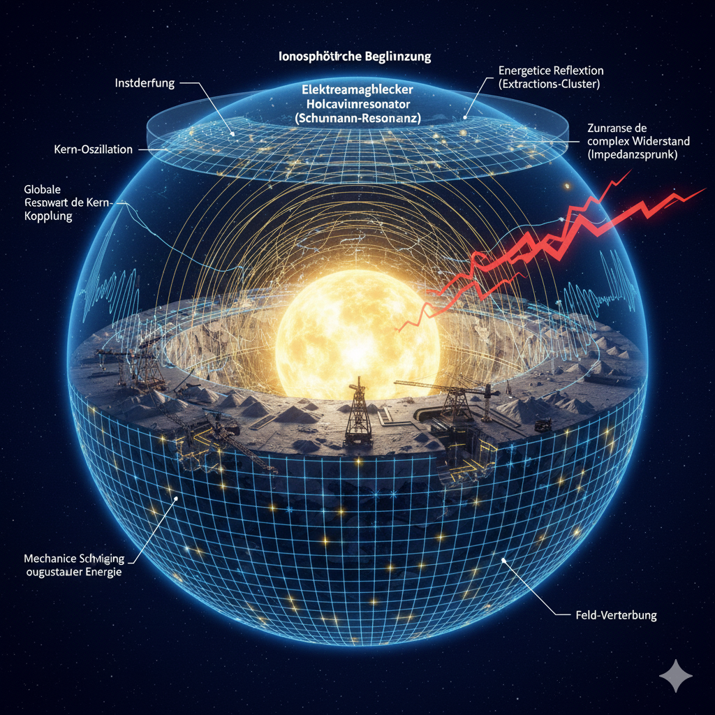 Die Erde bildet ein elektromagnetisches System, bestehend aus dem Primäroszillator (Kern) und dem Resonanz-System (Kruste/Mantel). Die Stabilität der Kern-Oszillation ist direkt an die energetische Rückkopplung (Impedanz) des Resonanz-Systems gebunden. Wenn das Resonanz-System seine Leitfähigkeit verliert, entfällt der stabilisierende „Widerstand“ für den Oszillator.