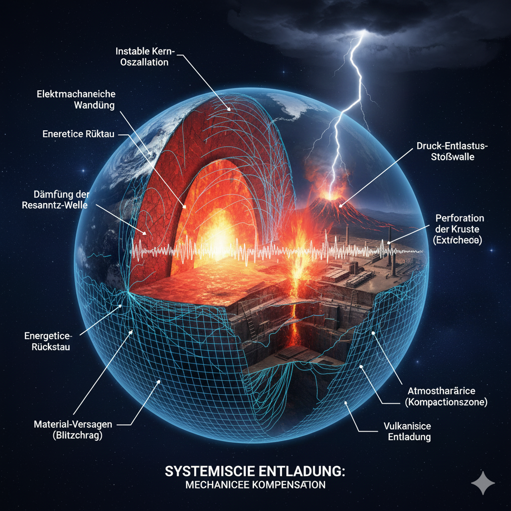 - Mechanische Entladung: Das System Erde ist gezwungen, den angestauten energetischen Druck durch physikalische Kompensation – vulkanische Eruptionen oder seismische Instabilitäten – an den Stellen der maximalen Krustenschwächung abzuführen.