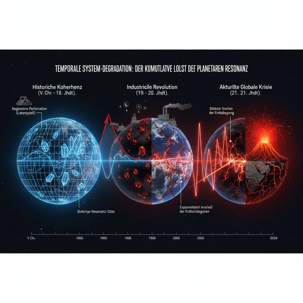 Die systemische Störung durch industrielle Perforation ist nicht reversibel. Jeder Eingriff in das Leiternetzwerk (Kapitel 2) führt zu einer dauerhaften Erhöhung des globalen elektrischen Widerstands. Es handelt sich um einen kumulativen Prozess: Mit zunehmender Extraktion sinkt die globale Resonanz-Güte des Planeten als elektromagnetischer Oszillator stetig ab.