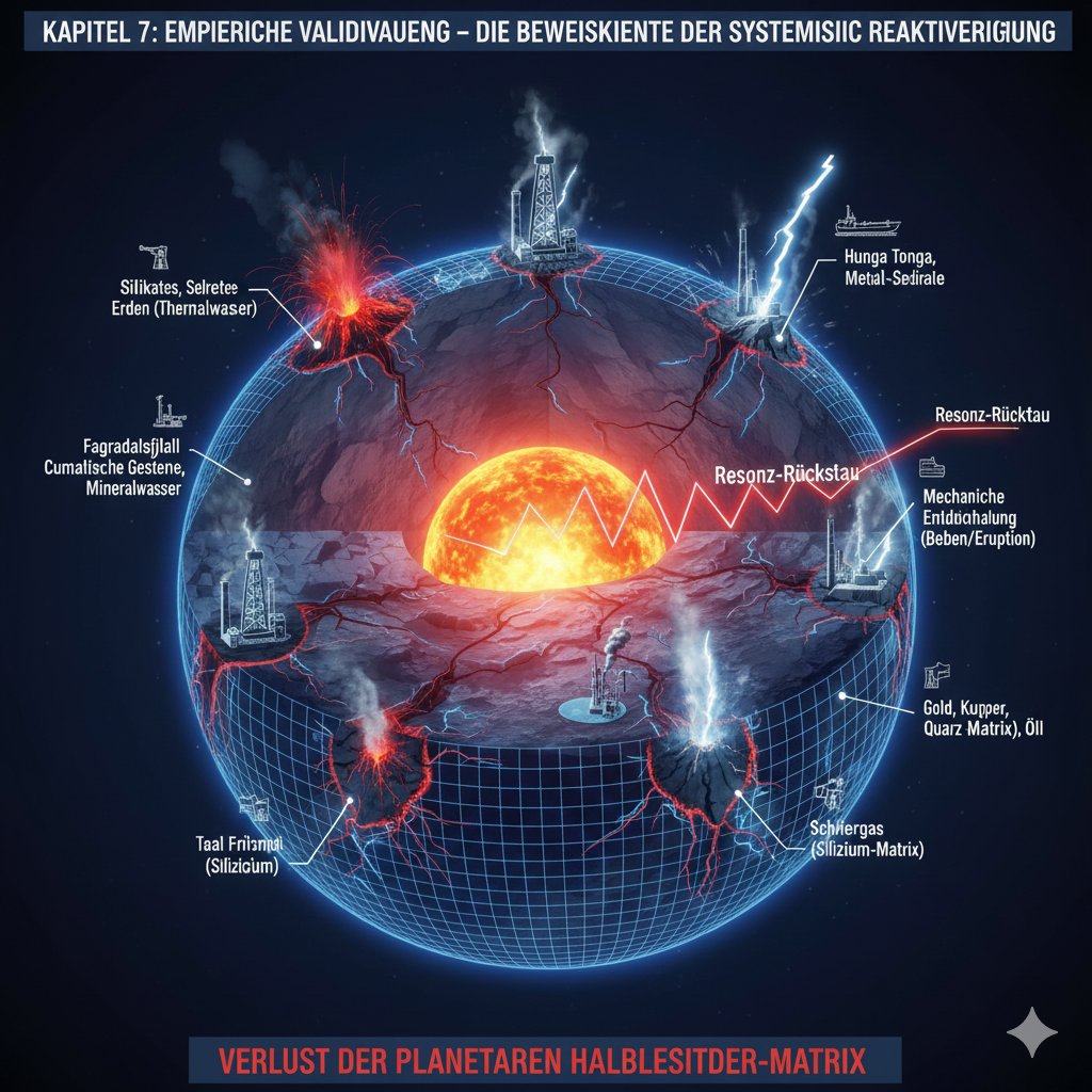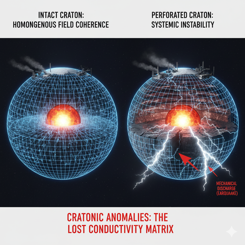 - Resonanz-Analyse: Die großflächige Entnahme von Sedimenten und Leitermaterialien induzierte eine tektonische Bruch-Reaktivierung, da die lokale elektromagnetische Stützkraft des Kratons entfiel.