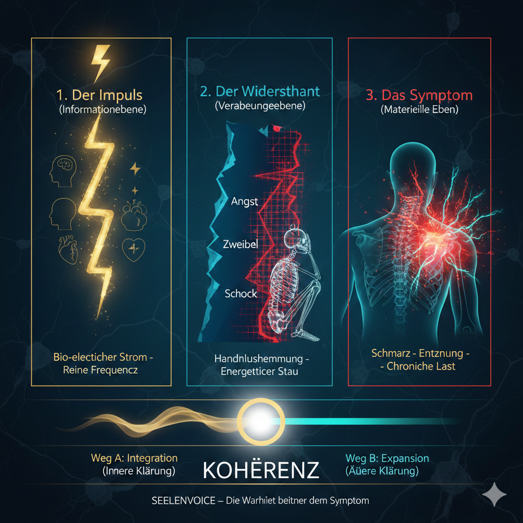 ​Hier antwortet das System auf den Impuls. Wenn wir eine Situation nicht „anpacken“ können – sei es durch äußere Umstände oder eine künstliche Trennung von unserer inneren Wahrheit – entsteht eine Handlungshemmung. Dieser Stillstand wirkt wie eine Blockade im Reizfluss. Die Energie staut sich an einer spezifischen biologischen Relaisstation, die exakt dem Thema entspricht, das wir biophysikalisch nicht lösen konnten.
